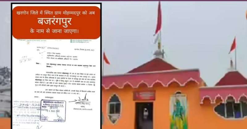 place name changed: कुछ दिन पहले राजधानी भोपाल में अशोका गार्डन इलाके का नाम बदलकर रामबाग कर दिया गया था। नाम बदलने की राजनीति ने एक बार फिर एमपी में सियासी हलचल को तेज कर दिया है। इसी कड़ी में खरगोन जिले के गोगावां ब्लॉक स्थित ग्राम मोहम्मदपुर (Mohammadpur) का नाम आधिकारिक तौर पर बदलकर 'बजरंगपुर' (Bajrangpur) कर दिया है। इस संबंध में आवश्यक अधिसूचना जारी कर यह बदलाव तत्काल प्रभाव से लागू हो गया है।