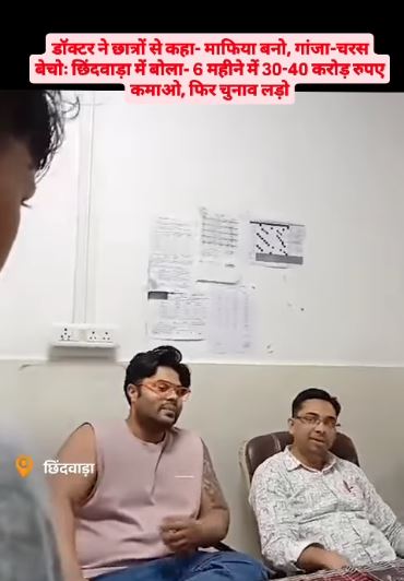 छिंदवाड़ा: जिला अस्पताल में एक ट्रेनी डॉक्टर सानिध्य दुबे का वीडियो वायरल हो रहा है। इस वीडियो में वह छात्रों को विवादित सलाह देते नजर आ रहे हैं। डॉक्टर दुबे छात्रों को डॉक्टर बनने की बजाय 'माफिया बनने, चरस-गांजा बेचने और चुनाव लड़ने' की सलाह दे रहे हैं। यह मामला तब सामने आया जब कुछ छात्र एमएलसी (मेडिको लीगल केस) कराने अस्पताल पहुंचे थे।